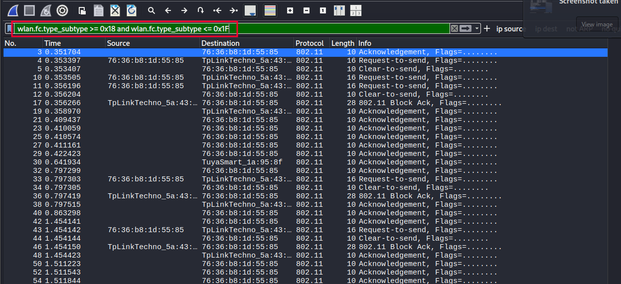 To see these types of packets, you can use the corresponding filter in wireshark. To view control packets, with subtypes ranging from 0x18 to 0x1F, you can use the following filter: