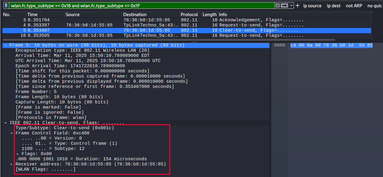 | 01 | 1100 | CTS | wlan.fc.type_subtype == 0x1C | wlan.fc.type_subtype == 0x1C |