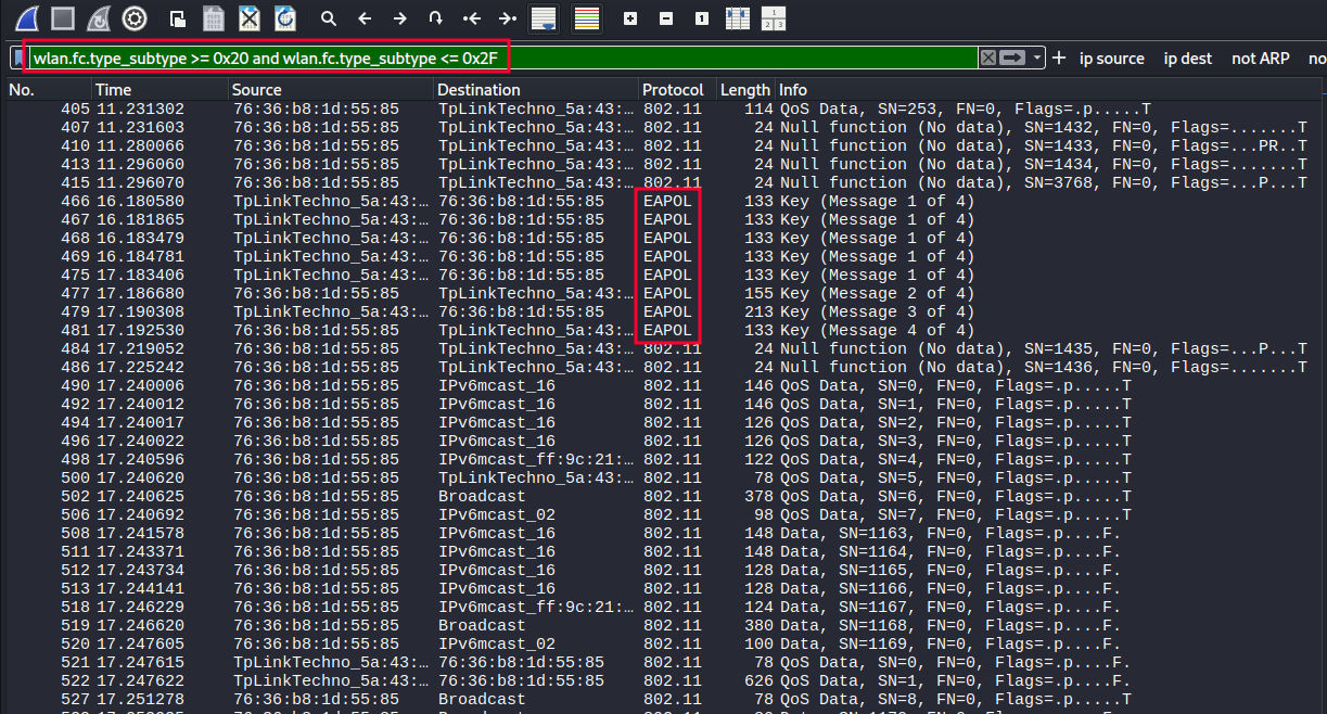 To make the identification task easier, specific filters have been applied within Wireshark. The EAPOL filter has isolated the packets corresponding to the EAPOL protocol, essential for the analysis of the 4-way handshake. Also, using wlan.fc.type == 0x00 – wlan.fc.type == 0x0D the management frames, including Beacon, Probe, Authentication, and Association, have been identified.