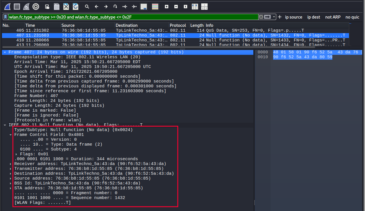 Analyzing a NULL frame in Wireshark, of subtype 0x24, the following fields can be seen:
