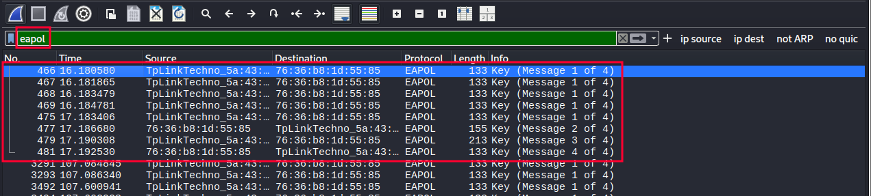EAPOL frames can be displayed in Wireshark using the “EAPOL” filter: